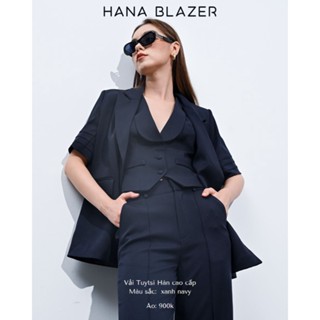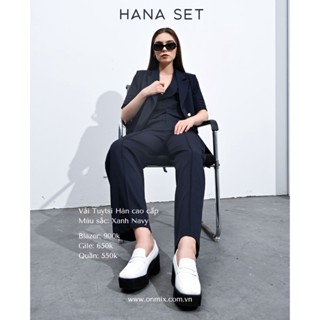 Set Suit Áo Blazer Tay Ngắn, Gile Basic, Quần Ống Suông ONMIX, Vải Tuytsi Xanh Navy