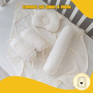 Gối sơ sinh, combo set đồ sơ sinh, 4 món, đồ cho trẻ sơ sinh, xô muslin, handmade, trắng kem