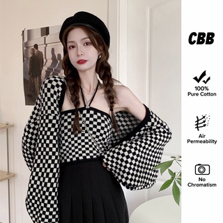 Porozi Nữ Hàn Quốc Áo yếm \ đan len Cardigan kẻ caro Bộ đồ hai mảnh (Cần mua riêng)