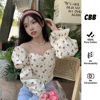 Porozi Áo kiểu tay phồng cổ vuông họa tiết hoa phong cách retro Hàn Quốc xinh xắn cho nữ