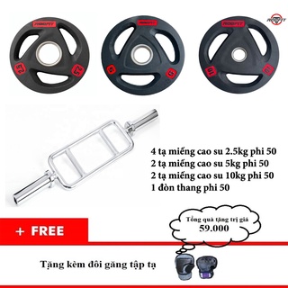 Combo đòn tạ hình thang phi 50 + 40kg tạ miếng cao su 3 lỗ phi 50 (4 miếng 2.5kg, 2 miếng 5kg, 2 miếng 10kg) + găng tay