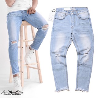 Quần jean nam rách gối xanh nhạt dáng skini đẹp ống côn hàng cao cấp xuất khẩu Hàn Quốc chính hãng Routine mới 2019