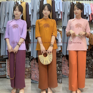 Đồ lam đi chùa giá sỉ # Pháp phục nữ truyền thống bà lai thêu hoa sen # hàng loại 1 phom dáng chuẩn Sen Hồng - mã B4