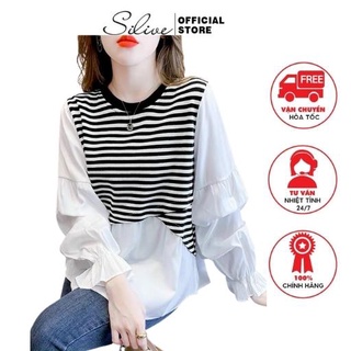 Áo len kẻ phối sơ mi tay bồng kiểu dáng xinh xắn, trẻ trung.