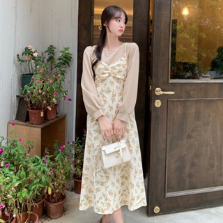Đầm Midi Dài Tay In Hoa Phong Cách Vintage Hàn Quốc Thời Trang Mùa Xuân