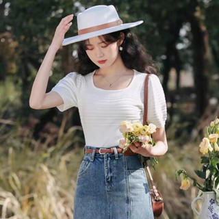 SUXI Áo Dệt Kim Tay Phồng Ngắn Cổ Vuông Màu Sắc Đơn Giản Thời Trang Mùa Hè Cho Nữ