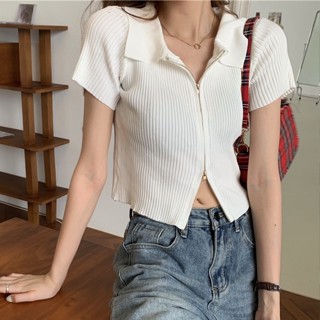 SUXI Áo Dệt Kim Ngắn Tay Phối Khóa Kéo Thời Trang Hàn Quốc Cho Nữ