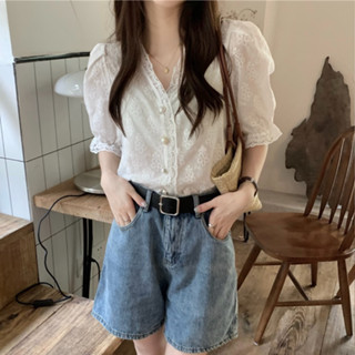 SUXI Áo Kiểu Tay Ngắn Phồng Phối Ren Màu Trắng Thời Trang Mùa Hè Xinh Xắn Cho Nữ