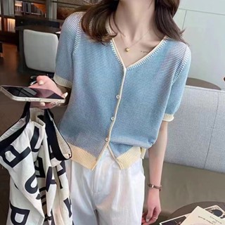 Áo croptop SUXI dệt kim mỏng tay ngắn dáng rộng cổ chữ V thời trang mùa hè cho nữ