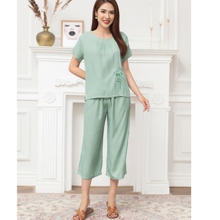 Bộ đồ mặc nhà trung niên lanh nhung Vicci áo cộc,quần dài BGDM.082
