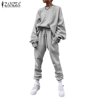 Set đồ nữ Zanzea gồm áo tay dài cổ tròn và quần dài lưng co giãn màu trơn phong cách đường phố thể thao