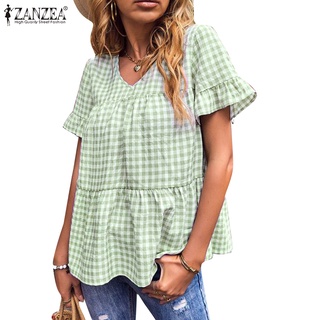 ZANZEA Áo Kiểu Tay Phồng Họa Tiết Sọc Caro Thời Trang Cho Nữ