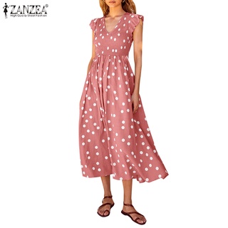 Zanzea Đầm Nữ Cổ Chữ V Tay Xếp Nếp Họa Tiết Chấm Bi Phong Cách Châu Âu