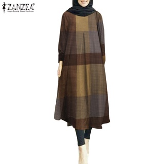 Áo đầm dài ZANZEA dành cho nữ thiết kế tay dài cổ chữ O in họa tiết kẻ ô phong cách Hồi giáo đơn giản
