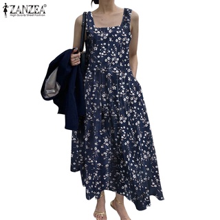 Đầm dài ZANZEA không tay cổ vuông có túi in họa tiết thời trang dành cho nữ