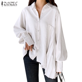 Áo kiểu ZANZEA cổ lật tay dài dáng rộng màu trơn phối xếp ly đơn giản phong cách Hàn Quốc thời trang dành cho nữ