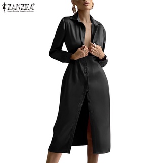 Đầm ZANZEA sơ mi dài tay dáng mỏng phối nút cài thời trang châu Âu thời trang cho nữ