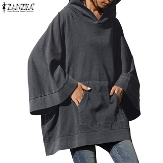 Áo hoodie ZANZEA màu trơn tay áo rộng phối túi mặt trước thời trang mùa đông cho nữ