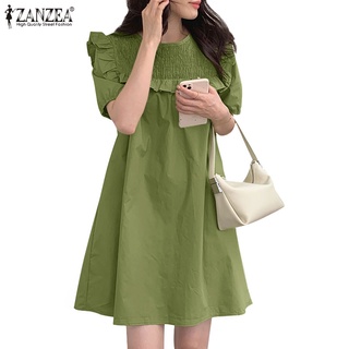Đầm ZANZEA tay phồng xếp ly phong cách Hàn Quốc thời trang cho nữ