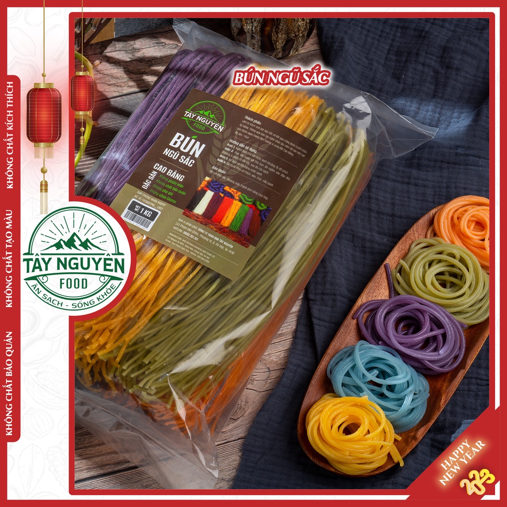 Mỗi loại bún khô được chế biến từ một nguyên liệu có màu đặc trưng, ví dụ bún ngô làm nguyên liệu ngô tẻ có màu vàng. Ngoài ra còn có bún làm từ gạo lứt đỏ, lá chùm ngây màu xanh lá, hoa đậu biếc màu xanh trời, lá cẩm màu tím, khoai lang tím, hay quả gấc hoặc bún trộn từ các màu trên. Với nguyên liệu 100% từ tự nhiên, không phẩm màu hay chất bảo quản, Bún ngũ sắc Cao Bằng được phân phối bởi Tây Nguyên Food - Việt Nam tự tin mang đến cho bạn trải nghiệm tốt nhất. Vì sản xuất theo phương pháp thủ công và rau củ tự nhiên nên Bún ngũ sắc Cao Bằng rất rốt cho sức khoẻ và cơ thể. Tây Nguyên Food - Việt Nam