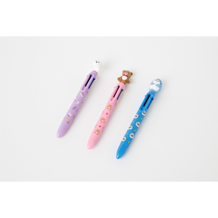 Bút bi 6 màu: đen, xanh lam, xanh lục, hồng, tím và đỏ Thiết kế có hình chú gấu teddy đáng yêu được gắn trên đầu bút. Tiện lợi hơn vì tất cả 6 màu đều có trong một cây bút teddy xinh xắn.