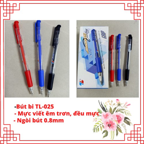 Bút bi TL-025 được sử dụng nhiều trong văn phòng và cho học sinh ....., - ngòi bút 0.8mm phù hợp cho những người thích viết nét bút lớn. - Mực viết êm trơn, ra đều mực không bị ngắt quãng. - Bút có dạng nút bấm, có thể cài vào áo , tập, sổ - Chỗ tay cầm bút viết có miếng nhựa mềm giúp tránh bị đau khi viết quá lâu - Khi không dùng nữa thì bấm nút để ngòi lui vào trong tránh hư đầu bút #butbi#butngoi0.8