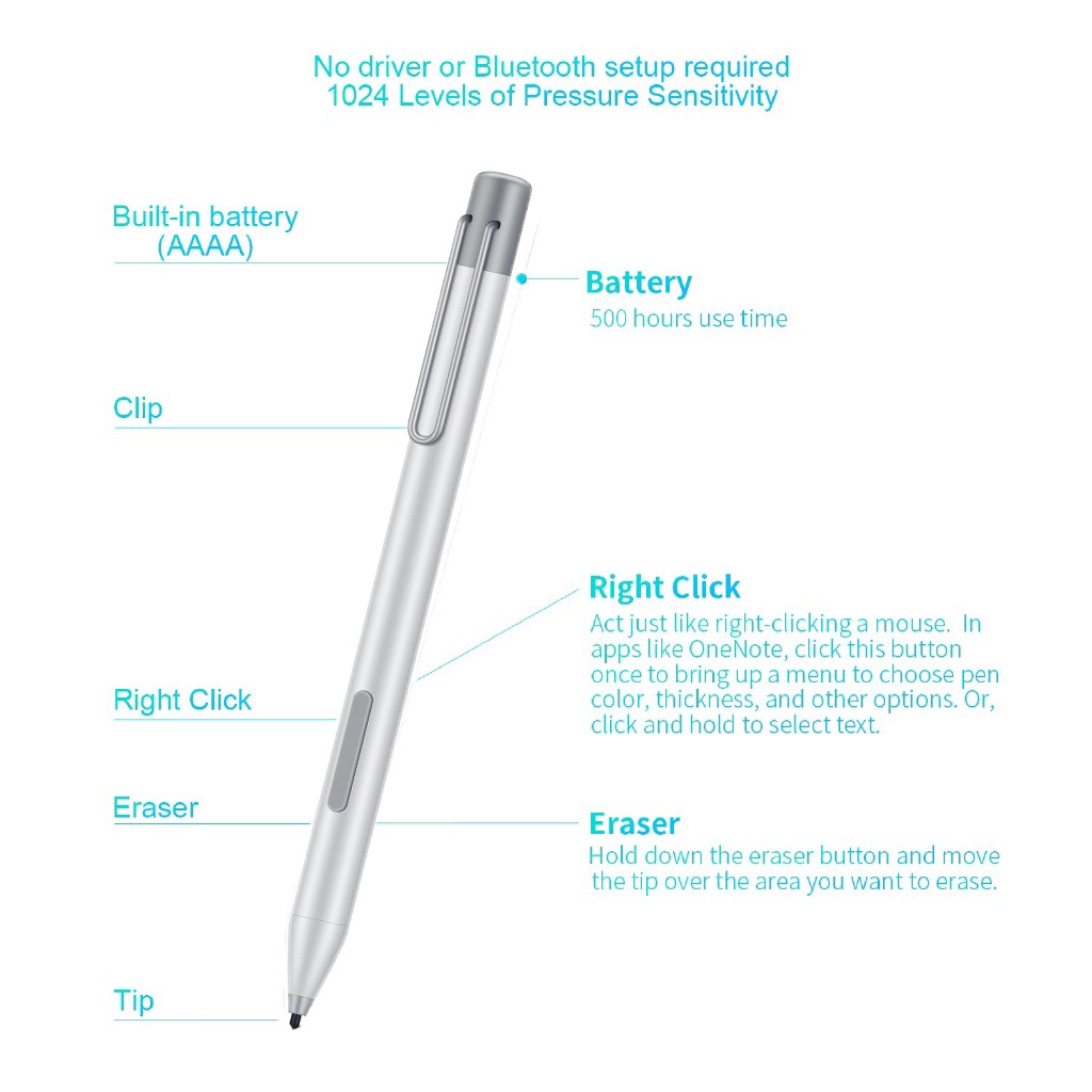 Cảm giác như một cây Bút thật trên giấy khi viết trên máy tính bảng có độ phân giải cao hoặc màn hình máy tính xách tay có Active Pen. Cho dù bạn đang ghi chú, tạo ra các tác phẩm nghệ thuật hoặc kiểm tra email, cây bút này cảm thấy tự nhiên và tương tác nhanh chóng và dễ dàng với màn hình của bạn. Phù hợp hoàn hảo cho các nghệ sĩ, kiến Kiến trúc, nhân viên, giáo viên, sinh viên và trẻ em để viết, vẽ, đánh dấu, ký tên và ghi chú mọi lúc, mọi nơi. 【1024 Điểm áp suất】 Bút cảm ứng chủ động hoàn hảo để viết tay, vẽ, đánh dấu, chữ ký và ghi chú. Mức độ nhạy cảm áp suất 1024 đáp ứng cảm ứng nhẹ nhất. Phản hồi tức thì, tái tạo viết tay thực sự chính xác, không có bất kỳ độ trễ và độ lệch nào khi viết 【Thời Gian sử dụng siêu dài】: Được cung cấp năng lượng bởi pin AAAA trong 500 giờ sử dụng (2 giờ mỗi ngày, có thể sử dụng trong khoảng 300 ngày). Công nghệ tiết kiệm điện - Tự động tắt nguồn trong 2 phút 【Tương Thích rộng】 Bút cảm ứng tương thích với Microsoft Surface Pro 6 (2018), Surface Pro 5 (2017), Surface Pro 4, Surface Pro 3, Surface Laptop, Surface Laptop 2 (2018), Surface Surface Studio, Surface Studio 2, Surface Book 1, Surface Book 2 (2018), Surface Go-win 10 phiên bản 1803. Bút này cũng tương thích với Asus Transformer3, HP Envy 17-aexxx, Dell Inspiron 13 7373, v.v. (Vui Lòng xem thêm trong mô tả sản phẩm) 【Chất Lượng cao và độ an toàn cao】 Bút stylus được làm bằng hợp kim nhôm chất lượng cao, siêu nhẹ và chống mài mòn. Bút đã nhận được chứng nhận Microsoft, FCC và RoHS, đảm bảo an ninh cho bạn khi sử dụng và độ nhạy cao.