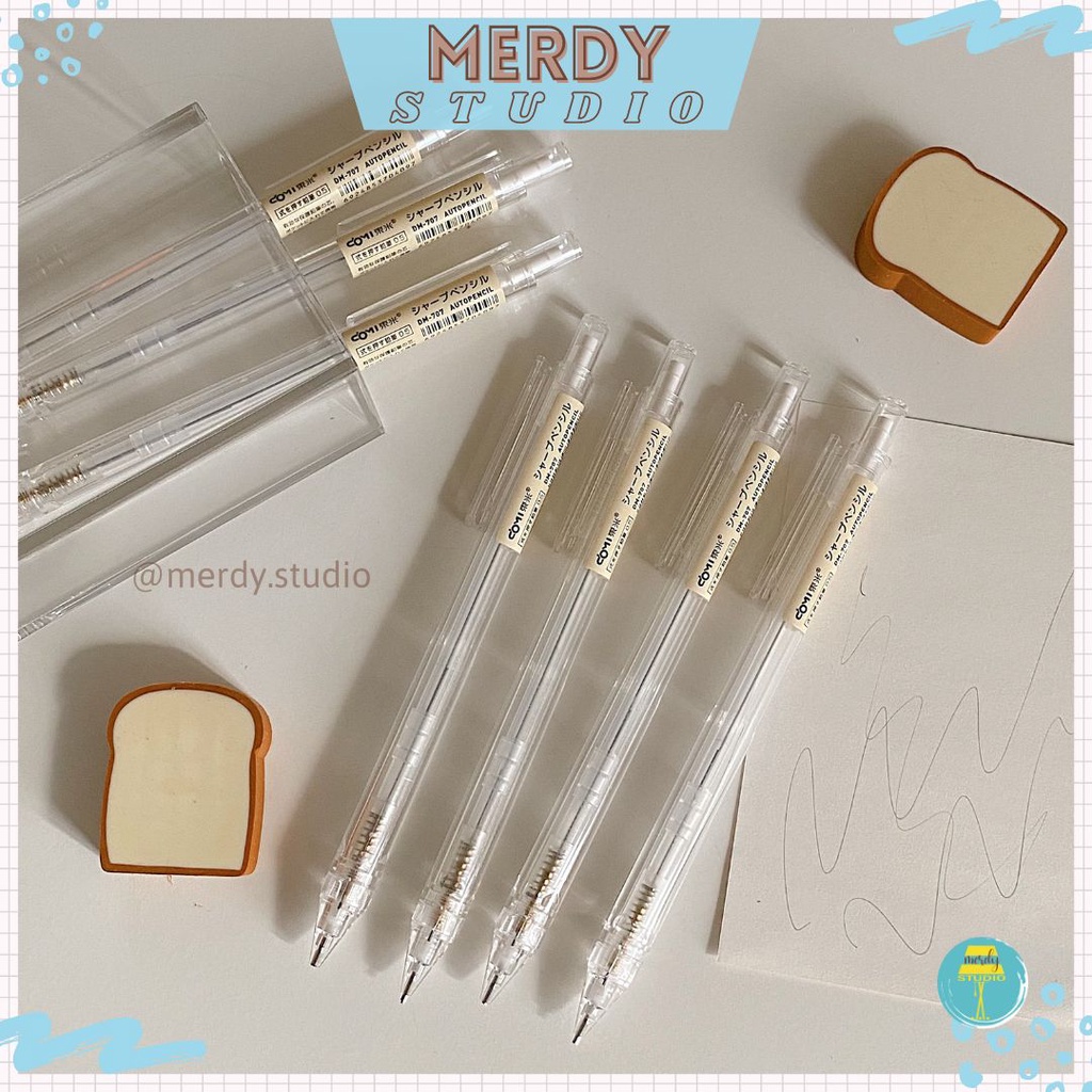 Những cây bút chì kim nhà Domi với thiết kế thân bút trong suốt mảnh mai và tem nhãn màu nâu be rất xinh xắn.
