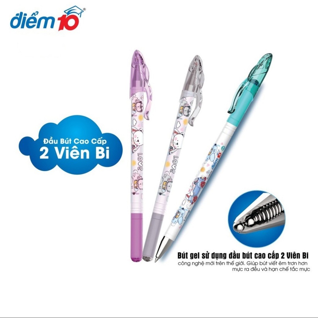 Tên danh mục Bút Gel Thương hiệu Điểm 10 Đường kính viên bi 0.5 mm Màu mực Xanh/đen/tím Đóng gói 20 cây/hộp Trọng lượng 180 gram/hộp Tính năng nổi bật:
