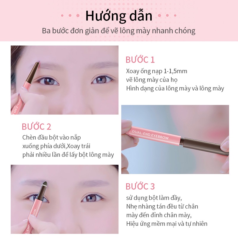 ● Bút kẻ lông mày hình lưỡi kiếm + phấn kẻ lông mày, tiện lợi hai trong một; thiết kế dạng xoay để tạo lớp trang điểm tự nhiên và hoàn hảo ● Sản phẩm không dễ bị nhòe, lâu trôi và nó là một công thức ổn định, dịu nhẹ cho da.