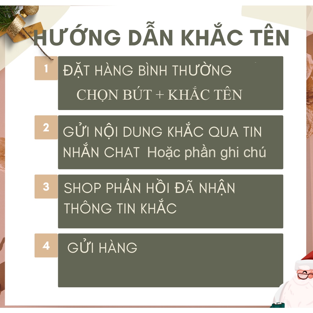 THÔNG TIN SẢN PHẨM ✔ Mã sản phẩm: BK02 ✔ Đồng bộ sản phẩm: 01 bút + 01 hộp + 02 ngòi ✔ Chất liệu: Kim loại thép không ghỉ, phủ sơn tĩnh điện ✔ Màu bút: Đen ✔ Màu mực: Xanh hoặc đen ✔ Nét mực: Mực nước 0.5mm ✔ Khắc theo yêu cầu: Có thể khắc tên, lời chúc, logo, icon ngộ nghĩnh (trái tim, cỏ 3 lá, 4 lá, bông hoa, ....) ✔KH nhắn tin nội dung cần khắc cho shop khi đặt hàng. Ví dụ: Nắp bút khắc: abc, thân bút khắc: xyz ✔Thiết kế sang trọng, lịch lãm ✔ Hộp đựng bút sang trọng, đẹp mắt. Kích thước: dài x rộng x cao = 17,5cm x 6,2cm x 2,5cm ------------------------------------------------------------------------------------------------------------------------------------------- CAM KẾT 👍 Tư vấn nhiệt tình, chu đáo 👍 Sản phẩm sau khi khắc xong được chụp ảnh và gửi cho khách hàng xem trước khi gửi 👍 Hỗ trợ nhanh chóng khi gặp vấn đề phát sinh liên quan vận chuyển, hỏng hóc, móp méo, nhầm hàng, thiếu hàng...