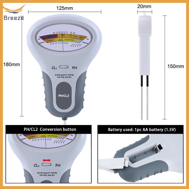 - Công cụ lý tưởng để đo pH & Clo một cách nhanh chóng và chính xác để giữ cho hồ bơi hoặc spa của bạn trong phạm vi clo và pH an toàn . - Máy kiểm tra mức độ pH và clo (Cl2) điện để theo dõi định kỳ nồng độ pH và clo trong bể bơi , spa và các nguồn nước khác nhau . - Khi clo và ph được đánh bay từ nước bọt , nó có thể gây tiêu chảy và nhiễm trùng tai và da . --Lưu Ý : Máy dò không được khuyến khích chìm trong nước ngoài hồ bơi hoặc nước spa . Tính năng '
