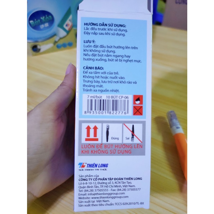 Bút xóa Thiên Long CP-06 7ml Không độc hại ( 1 cây ) Thông số kĩ thuật : Tên danh mục Bút xóa Thương hiệu Thiên Long Dung tích mực 7 ml Hình dáng thân bút Thân tròn Đóng gói 10 cây / hộp Xuất xứ Việt Nam Bút xóa Thiên Long CP-06 có kiểu dáng thân tròn, vừa tầm tay , thuận tiện khi sử dụng. Cán bằng nhựa đủ màu thể hiện sự trẻ trung , năng động. Đầu bút bằng kim loại có lò xo đàn hồi tốt. Đặc điểm : - Kiểu dáng bút được thiết kế hết sức ấn tượng, thích hợp với người dùng trẻ tuổi là HS, SV. Thân bút tròn, bằng nhựa mềm dễ cầm và không mỏi tay khi xóa. - Thân bút có nhiều màu sắc: Hồng, xanh dương, xanh lá, cam. - Công nghệ vượt trội giúp mực xuống đều hơn. - Bút ít bị tắc mực, độ che phủ bề mặt tốt hơn và mau khô, giúp cho chữ viết rõ ràng, không bị lem, nhòe. Dung tích mực: 7 ml Lưu ý : - Đặt bút hướng lên khi không sử dụng - Lưu trữ nơi khô ráo , thoáng mát , tránh tiếp xúc trực tiếp với ánh nắng mặt trời - Lắc đều bút trước khi sử dụng