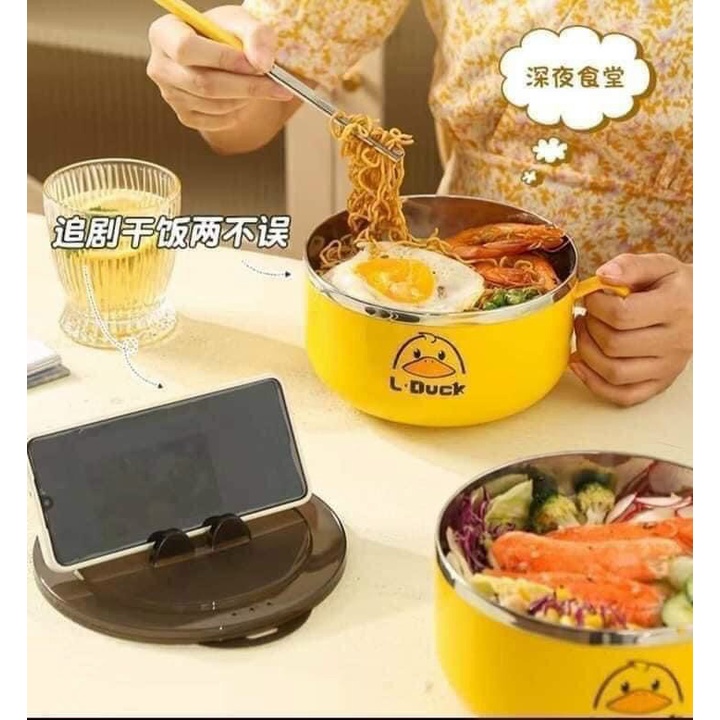 Ca ăn mì inox giữ nhiệt có nắp đậy Con Vịt Vàng siêu cute có khe rót nước tiện lợi
