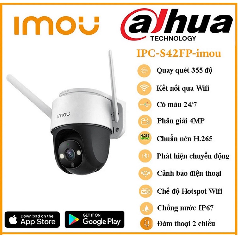 Thông số kỹ thuật camera IP Wifi PTZ 4.0 megapixel IPC-S42FP-IMOU – 4MP Fullcolor Cruiser Wifi camera wifi Imou – Tích hợp đèn trợ sáng cho hình ảnh ban đêm có màu – Độ phân giải 4Megapixel CMOS 1/2.7 inch – Chuẩn hình ảnh H265. – Chế độ ngày đêm(ICR), chống ngược sáng DWDR, tự động cân bằng trắng (AWB), tự động bù tín hiệu ảnh (AGC), bù sáng (BLC), Chống nhiễu (3D-DNR). – Ống kính cố định 3.6mm, góc nhìn 88°(H), 46°(V), 107°(D). – Tầm nhìn ban đêm 30m (Led/ hồng ngoại). – Hỗ trợ quay quét 355°Pan & 0~90°Tilt. – Hỗ trợ chế độ AP mode. – Tích hợp đèn Spotlight cảnh báo. – Tích hợp còi báo động. – Tính năng phát hiện chuyển động, phát hiện con người. – Lắp đặt camera tính năng đàm thoại 2 chiều. – Tính năng theo dõi thông minh Smart Tracking