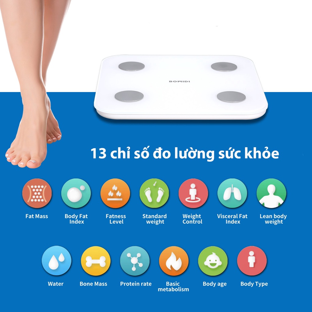 Đo lường 13 chỉ số cơ thể, theo dõi cân nặng và sức khỏe BOMIDI Body Fat Scale S1 có thể đo lường được 13 chỉ số sức khỏe, giúp người dùng có thể đo lường và kiểm soát cân nặng, cân đối các chế độ tập luyện và ăn uống để duy trì cơ thể khỏe mạnh và cân đối nhất. Theo đó, máy có thể đo lường cân nặng, chỉ số BMI, chỉ số mỡ trong cơ thể,....