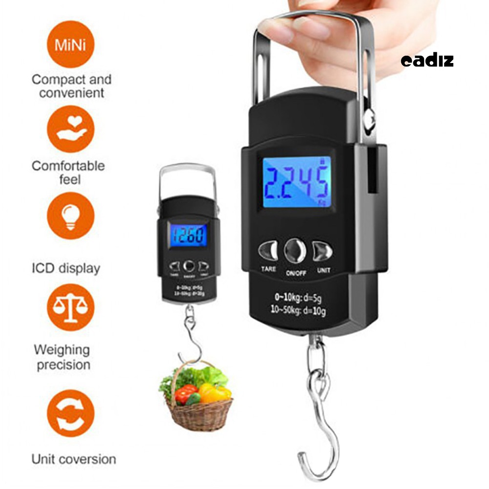 Loại sản phẩm: Cân điện tử Chất liệu: ABS Đơn vị đo lường: Kg / lb / oz Tải trọng: 50Kg / 10g Pin: 2 x Pin AAA (Không bao gồm Pin) Đặc điểm: Màn hình kỹ thuật số, Thiết kế móc, Có đèn nền, Gọn nhẹ Kích thước: 12,5cm x 9,5cm x 3,7cm / 4,92 " x 3,74 "x 1,46 " (Xấp xỉ)