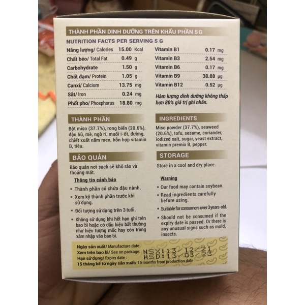 CANH RONG BIỂN MISO ASUZAC 40G (4GX10GÓI) CHAY MẶN ĐỀU DÙNG ĐƯỢC Xuất xứ: Việt Nam Chất liệu: TP: rong biển, đậu hủ, ngò rí, mè,… Hạn sử dụng: 15 tháng từ ngày sản xuất. Sản phẩm được bán bảo đảm còn ít nhất 135 ngày sử dụng. Lưu ý: không sử dụng SP khi hết hạn sử dụng. Mã: 8938501349385