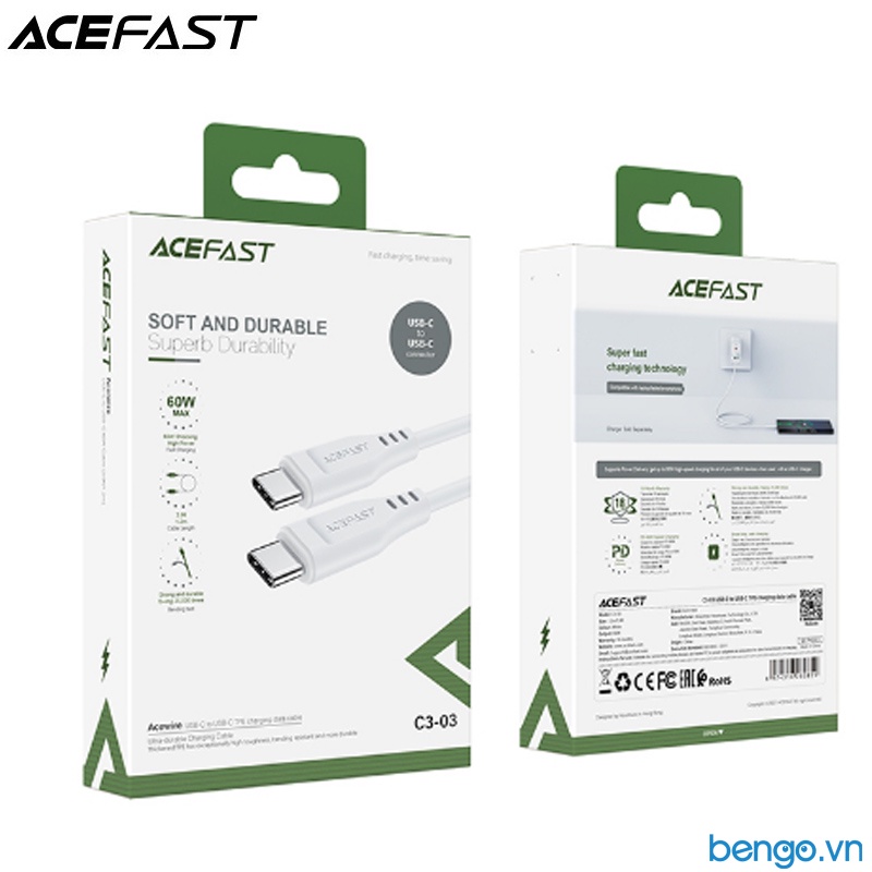 Cáp ACEFAST USB-C to USB-C dài 1.2m - C3-03 ----------------------- Lý do chọn sản phẩm này?! Cáp ACEFAST USB-C to USB-C dài 1.2m - C3-03 Hỗ trợ lên đến 20V / 3A - 60W Chất liệu vỏ bên ngoài và khớp nối là TPE mềm, dẻo dai Lõi: 22AWG (45 / 0.1) * 2C + 28AWG (16 / 0.08) * 3C + D (7 / 0.12) OD3.8mm Dòng điện tối đa là 3A Sạc & truyền tải dữ liệu nhanh Độ bền lên đến 25000 lần thử khi uốn cong dây Sạc cho máy tính xách tay và sạc nhanh 3A cho điện thoại Android Bảo hàng 18 tháng ----------------------- Mô tả sản phẩm Cáp ACEFAST USB-C to USB-C dài 1.2m - C3-03 Cáp ACEFAST USB-C to USB-C dài 1.2m - C3-03 chất liệu bền bỉ, đường truyền ổn định và an toàn cho người dùng khi kết nối giữa các thiết bị hay sạc pin. Công suất và dòng điện cao, hỗ trợ người dùng sử dụng dễ dàng và nhanh chóng hằng ngày. Chất liệu cao cấp Cáp ACEFAST USB-C to USB-C dài 1.2m - C3-03 với vỏ ngoài làm bằng chất liệu TPE đem đến độ bền cao, đạt thử nghiệm 25000 lần thử khi uốn cong dây. Phần đầu cáp sạc cũng được gia cố rất kỹ lưỡng, không bị hở hay lỏng lẻo khiến đầu cáp dễ bị rơi ra ngoài khi có lực tác động. Chip thông minh được gắn bên trong lõi của dây cáp, nhằm hỗ trợ và nâng cao khả năng truyền dữ liệu/sạc nhanh chóng và ổn định. Hiệu suất truyền tải/sạc cao Cáp ACEFAST USB-C to USB-C dài 1.2m - C3-03 công suất truyền tải nhanh với dòng điện tối đa là 3A, hỗ trợ dây truyền tải dữ liệu và sạc pin giữa các thiết bị nhanh. Bảo vệ quá dòng, ngắn mạch giúp bạn an tâm hơn khi sử dụng. Tương thích với nhiều thiết bị Cáp ACEFAST USB-C to USB-C dài 1.2m - C3-03 với Hai đầu của phụ kiện đều là cổng USB-C thông dụng, mang đến khả năng tương thích đa dạng với nhiều thiết bị và phụ kiện khác nhau cực kỳ tiện dụng, bạn có thể sạc cho pin dự phòng, điện thoại,... Công suất sạc lên tới 60W, cho phép bạn sạc laptop siêu nhanh. ----------------------- Thông số kỹ thuật - Thương hiệu: ACEFast - Jack kết nối: USB-C to USB-C - Chức năng: Sạc và truyền dữ liệu - Chất liệu vỏ bên ngoài: TPE - Lõi: 22AWG (45 / 0.1) * 2C + 28AWG (16 / 0.08) * 3C + D (7 / 0.12) OD3.8mm - Hỗ trợ sạc máy tính xách tay 60W (20V / 3A), điện thoại Android - Kích thước: 1.2m (dài) - Màu sắc: Trắng, Đen ----------------------- Hotline: 0962159560 (ZALO, Viber…) Mua trực tiếp: - 590/13 Cách Mạng Tháng 8, Phường 11, Quận 3 (đối diện CV Lê Thị Riêng) Bengo Fanpage: https://www.facebook.com/bengostore Website: https://bengo.vn Phản ánh chất lượng: 0962 61 9191