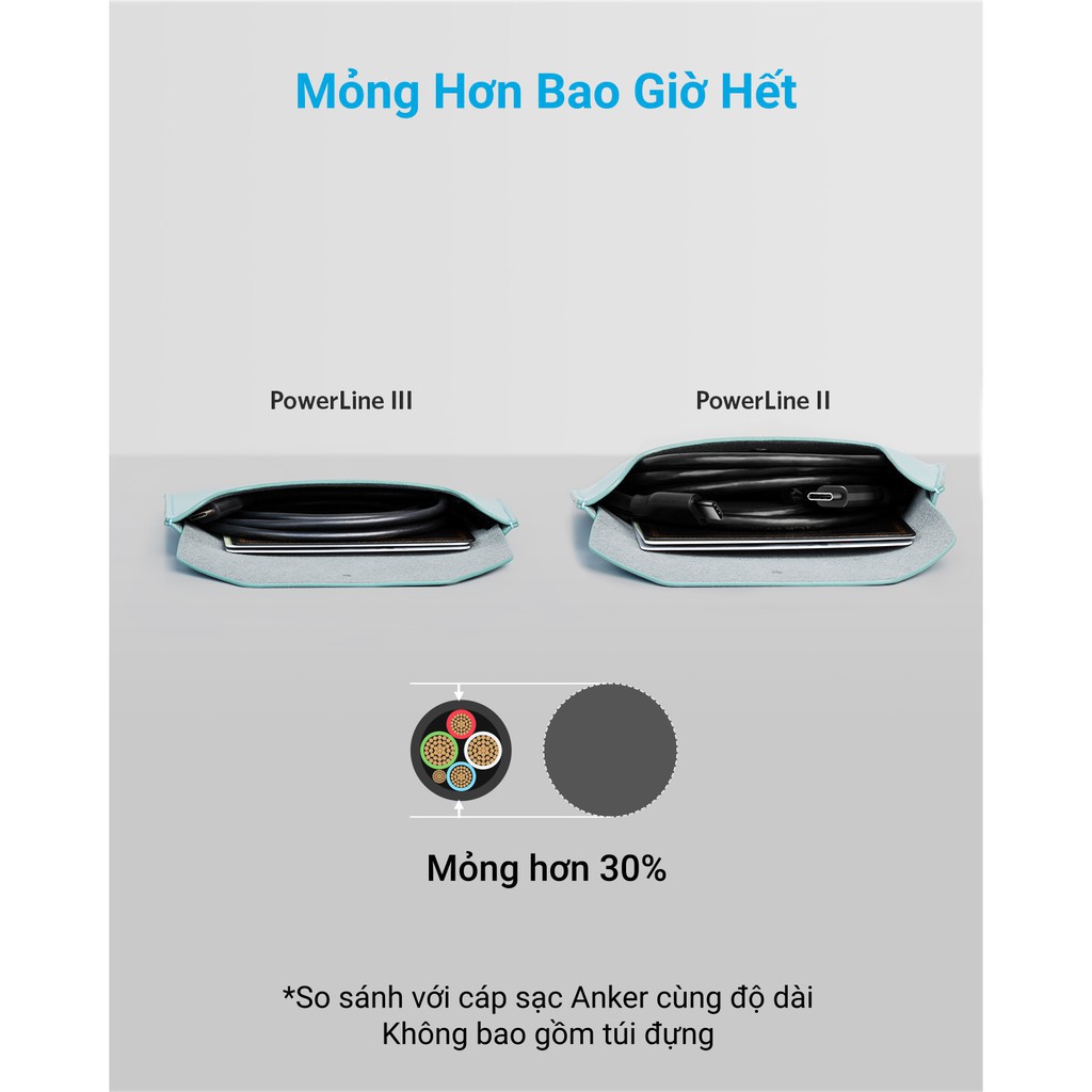 Dây Cáp Sạc Anker PowerLine III USB-C to USB-C 2.0 0.9m - A8852 - Thế hệ mới nhất của Powerline được thiết kế với bố trí bên trong mang tính cách mạng, tạo ra một dây cáp mỏng hơn và mạnh mẽ hơn bao giờ hết, và cũng mạnh mẽ. Tương thích với sạc tốc độ cao, công suất tối đa 60W cho phép sạc tốc độ cao với nhiều loại thiết bị bao gồm điện thoại, máy tính bảng và máy tính xách tay. Ghép nối với bộ sạc phân phối nguồn 18W (không bao gồm) để sạc Samsung S10 đến 50% chỉ trong 30 phút. Tay cầm được cải thiện được thiết kế với các đầu nối dài hơn, có kết cấu cho cảm giác cầm nắm thoải mái và dễ dàng hơn. Tiết kiệm không gian bàn làm việc Chiều dài 0.9/1.8m hoàn hảo để sử dụng trên máy tính để bàn, mang lại cho bạn Độ dài cáp vừa phải để kết nối điện thoại với máy tính xách tay của bạn mà không làm lộn xộn không gian. Truyền dữ liệu tốc độ cao truyền phim, nhạc hoặc toàn bộ thư viện ảnh trong vài giây với tốc độ truyền 480Mbps.
