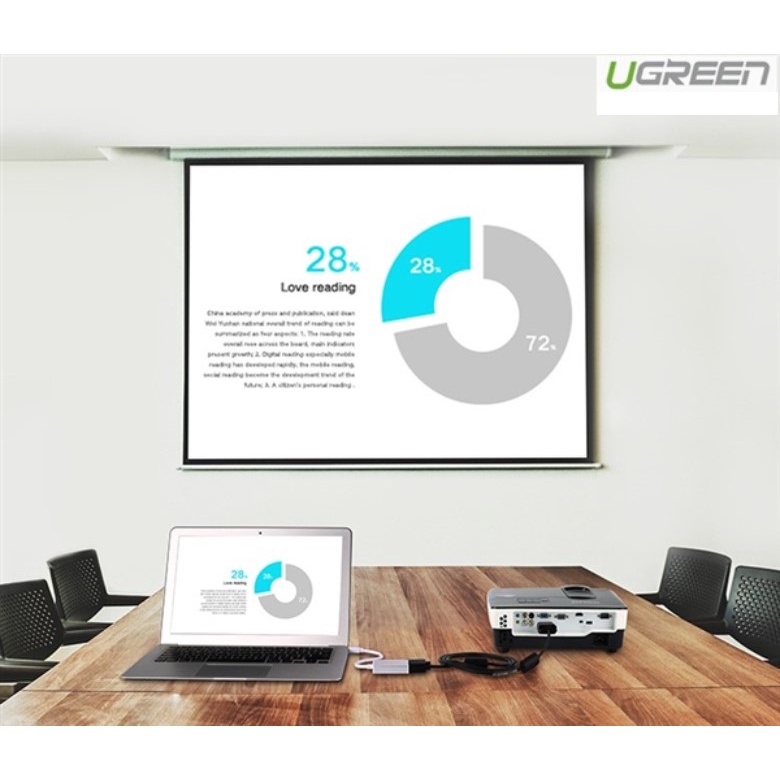 - Ugreen 20415 dùng để chuyển đổi tín hiệu dễ dàng giữa chuẩn DisplayPort sang VGA cho máy chiếu, không cần phải cài đặt phần mềm