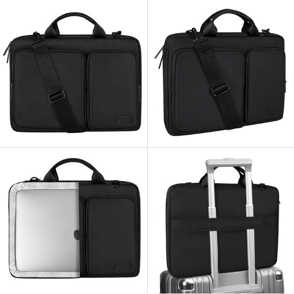 +Chất liệu :Polyester đặc tính độ bền cao, chống nước, giữ bề mặt luôn mới +Thiết kế form cặp cứng cáp, kiểu dáng classic, tinh tế, sang trọng, lịch lãm +Đường may chau chuốt tỉ mỉ, khoá kéo inox mạ +Lớp chống sốc đệm nhung rất dầy dặn, đảm bảo an toàn tuyệt đối cho laptop +Thiết kế cặp : nhiều ngăn linh hoạt trong đó có 1 ngăn chuyên biệt đựng laptop. Phía trước cặp có 2 ngăn linh hoạt có thể đựng ipad, chuột máy tính, điện thoại, sách vở, tài liệu,.... +Có đai gài hành lý phía sau lưng cặp tiện lợi cho những chuyến công tác +Quai đeo chắc chắn có thể điều chỉnh ngắn dài, quai xách đôi tiện lợi, móc khoá kim loại tuổi thọ cao +Có các kích thước khác nhau cho laptop 13, 13.3, 14, 15, 15.6inch.