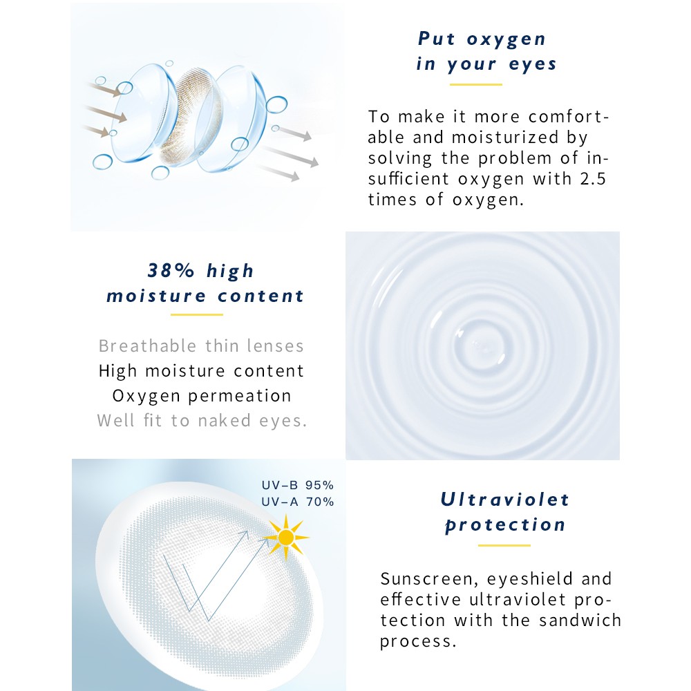 Đặc điểm: 1. Chiết xuất axit hyaluronic, thành phần giữ ẩm 2. Giúp đưa oxy vào mắt. Giúp đeo sản phẩm thoải mái và giữ ẩm hơn bằng cách giải quyết vấn đề thiếu oxy với lượng oxy lên đến 2.5 lần. 3. Độ ẩm cao 38% Kính áp tròng mỏng thoáng khí, độ ẩm cao, thẩm thấu oxy tốt. Sản phẩm rất phù hợp với mắt thường 4. Chống tia cực tím, giúp ánh nắng không làm chói mắt của bạn, Ngăn chặn hiệu quả tia cực tím, thoáng khí cả ngày và giữ độ ẩm tốt.
