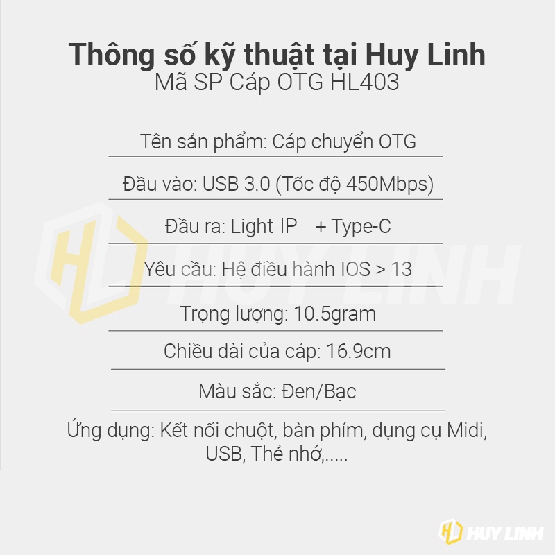 Điện Thoại & Phụ Kiện > Pin Gắn Trong, Cáp và Bộ Sạc > Cáp Sạc và đầu chuyển đổi > Cáp OTG cổng Táo, Type-C ra USB 3.0 dây dài 18cm HL403 dây vải bọc dù siêu bền