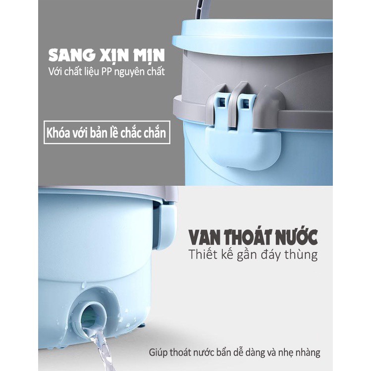 + Cây lau nhà tự vắt có thiết kế đáy thùng chống trượt giúp thùng ổn định hơn khi giặt và vắt , ở đáy thùng có nút thoát nước vô cùng tiện lợi không tốn công sức, bên trong xô là giỏ giặt và vắt bằng thép không gỉ giúp cho thoát nước nhanh và tách nước bẩn rất dễ dàng, thiết kế bằng thép không gỉ chấp liệu thép chống ăn mòn dễ dàng làm sạch.