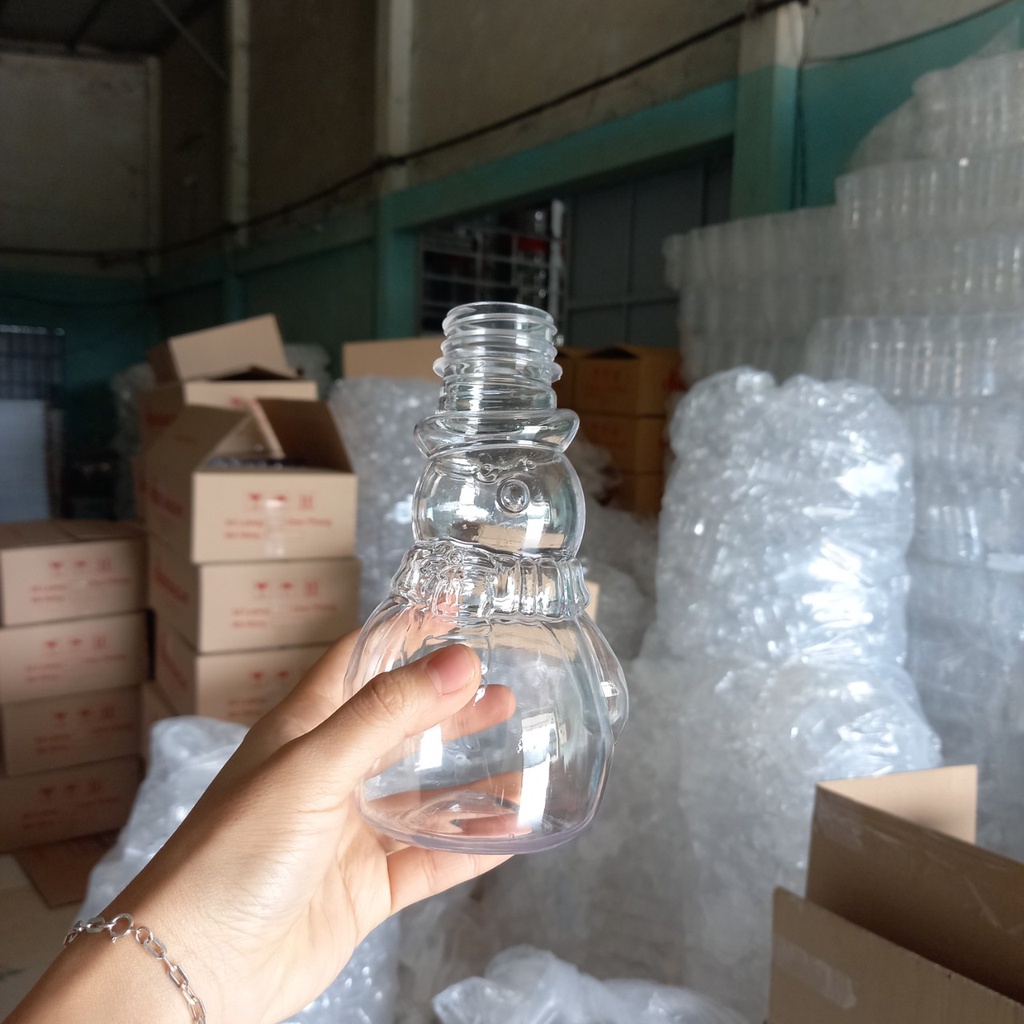 * Tên sản phẩm: Chai nhựa PET hình người tuyết * Thông tin sản phẩm: - Thể tích:400ml - Kích thước: 17x9x8cm - Chất liệu: Nhựa PET - Nắp: Nhôm, nhựa - Màu sắc: Trong suốt