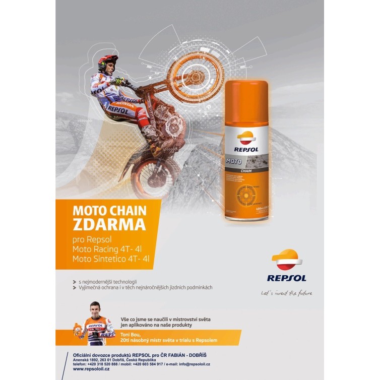 - Chai xịt sên Repsol Moto Lube Chain mang lại sự bảo vệ và vận hành tối ưu, giúp kéo dài tuổi thọ cho sên xe của bạn. Sản phẩm giúp giảm tiếng ồn, giúp sên trần khó bị bám bụi, bảo vệ ron cao su trên sên xích.