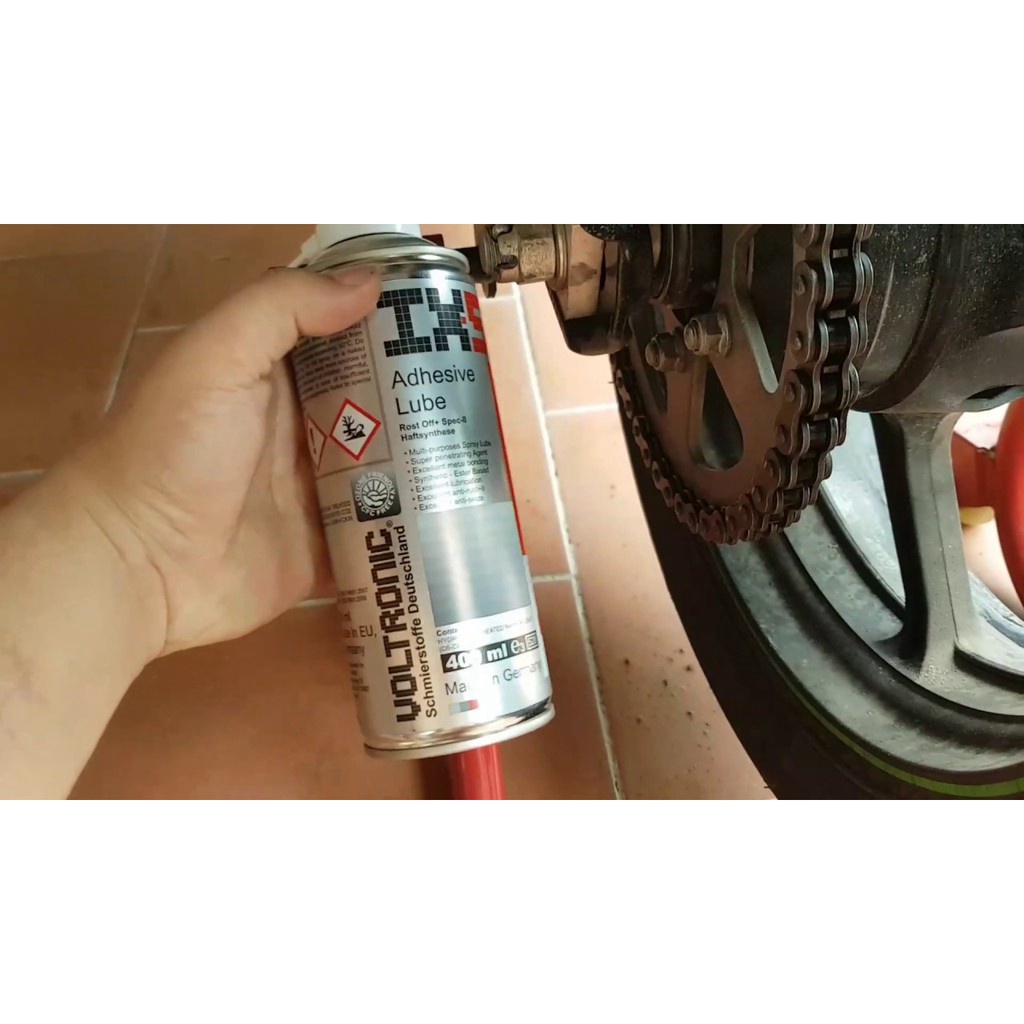 - Xịt dưỡng sên VOLTRONIC IX50 (400ml) được sản xuất trên dầu gốc Ester chất lượng cao cấp, có khả năng bám dính và bôi trơn vào các mắc sên dễ dàng. - Kết dính kim loại tuyệt vời cùng với đặc điểm chống ăn mòn tốt. - Sản phẩm còn có thể chống thấm nước giúp bảo vệ sên và bôi trơn lâu, chống văng ra mâm & xe, hiệu năng cao khi sử dụng với các dòng sên O-ring X-Ring Z-Ring. - Bên cạnh đó VOLTRONIC IX50 còn hạn chế tối đa việc bám dính bụi bẩn, tương thích tuyệt vời với cao su, silicone và polymer NBR, SNBR, ACM, AEM, FKM... Hướng dẫn sử dụng sản phẩm đúng cách nhất - Rửa sên và làm khô các chi tiết cần bôi trơn thật sạch. - Dùng Voltronic IX 50 xịt một lượng vừa đủ lên. - Để 10-15 phút để sản phẩm được thấm đều trên từng ngóc ngách. - Xịt lại 1 lần nữa để tạo lớp màng bảo vệ. - Hoàn tất.