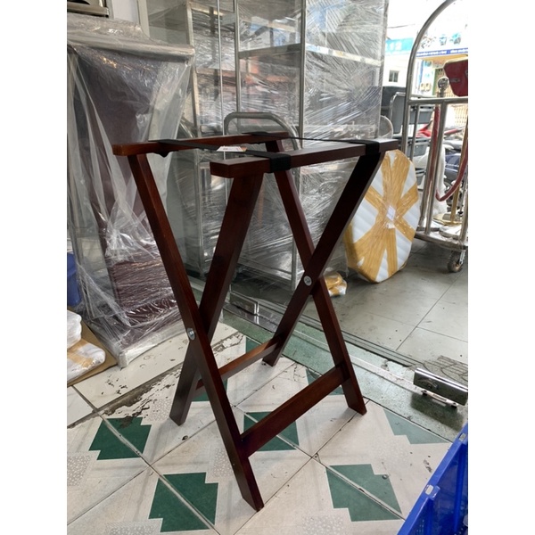 - Chân kệ để thức ăn - Kích thước: (L)520 x (W)410 x (H)800 mm - Chất liệu: gỗ - Kiểu 2 dây - Sản xuất theo yêu cầu - Hiệu: HORECA - Dùng để hành lý trong phòng khách sạn, hoặc kê mâm khay thức ăn cho nhà hàng. #khay, #kệ, #inox, #khách_sạn, #nhà_hàng