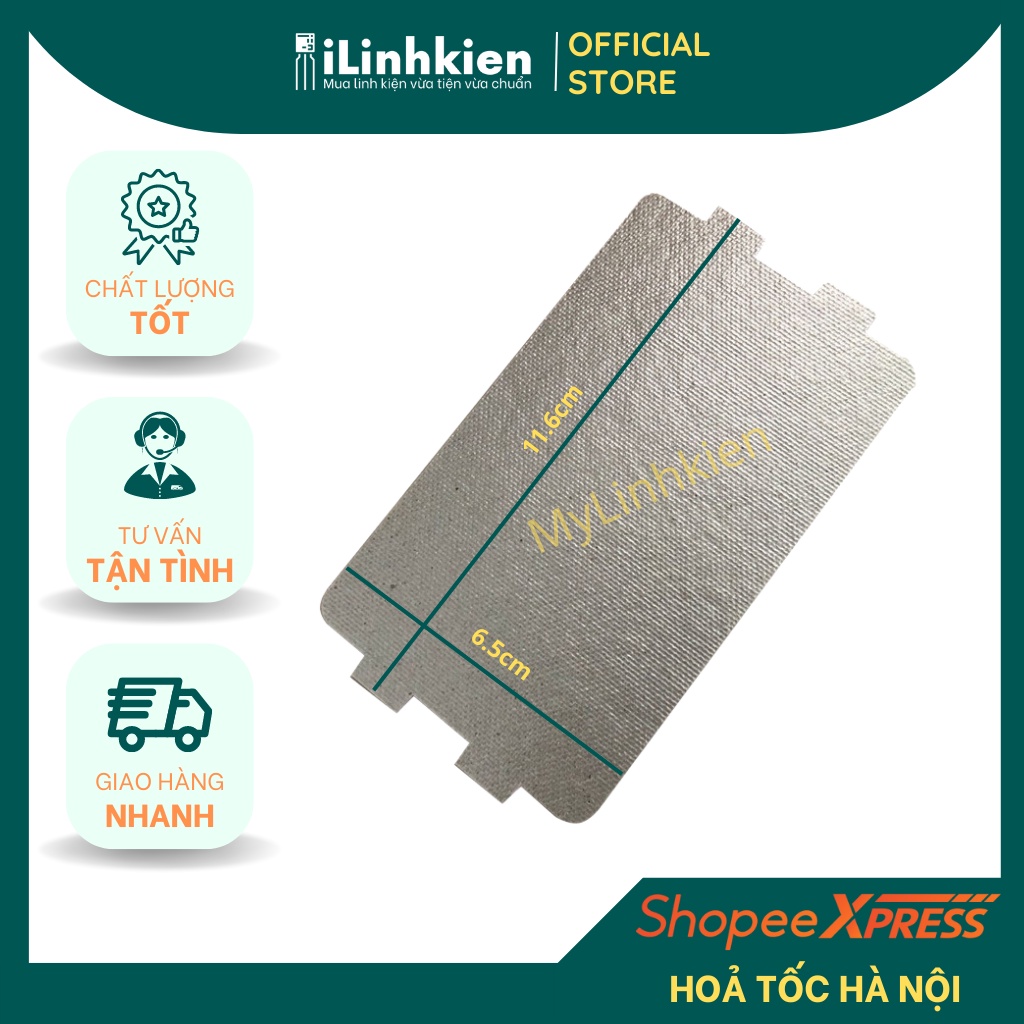 Thông số kỹ thuật tấm chắn lò vi sóng : - Kích thước : 6.5x11.5cm. - Dùng phổ biến trong các lò vi sóng hiện nay . - Dùng trong lò sharp , electrolux , panasonics ,.. hoặc lò vi song có tấm amiang như kích thước trên .